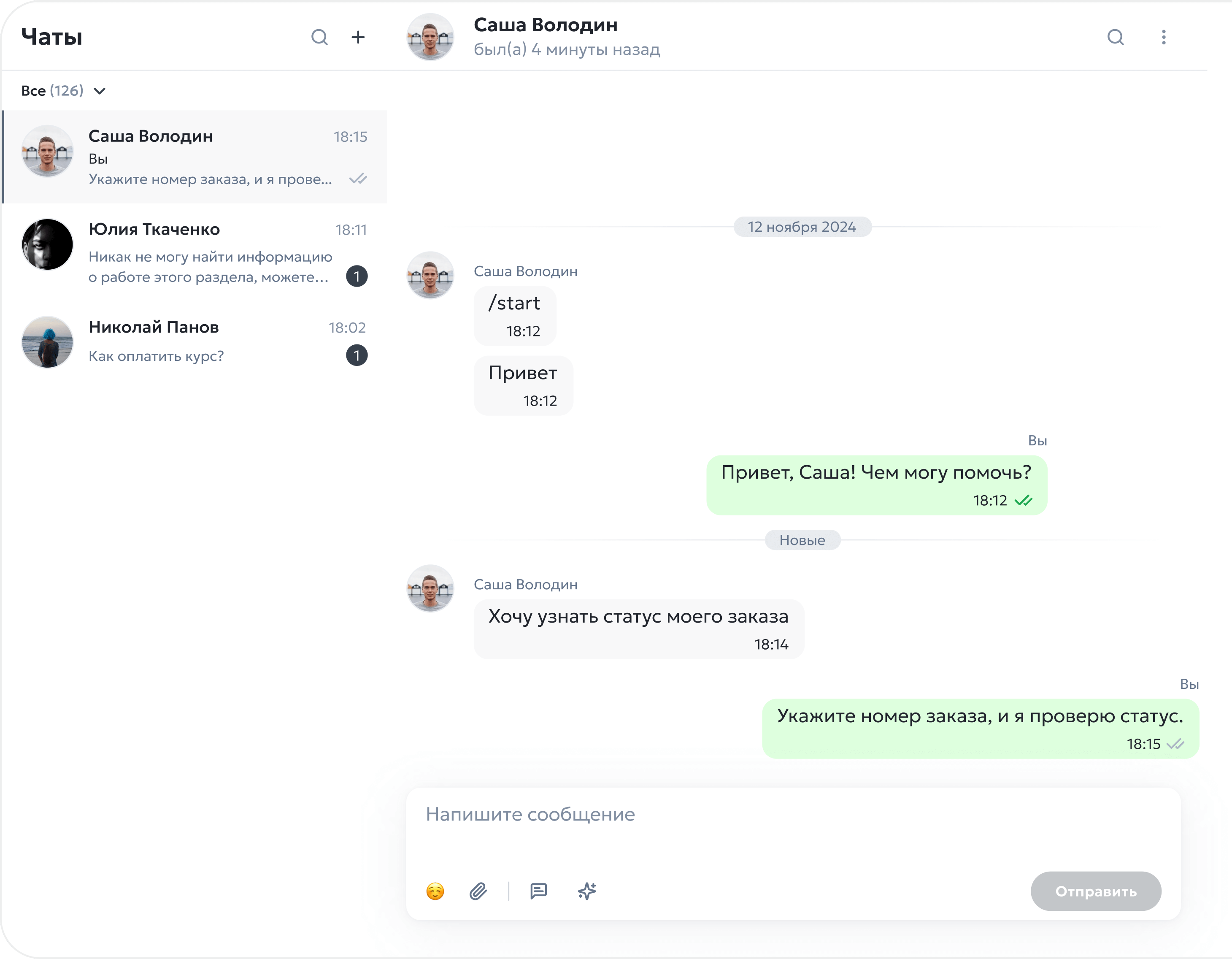 Решайте возникающие вопросы прямо в чате для роста лояльности и конверсий продаж.